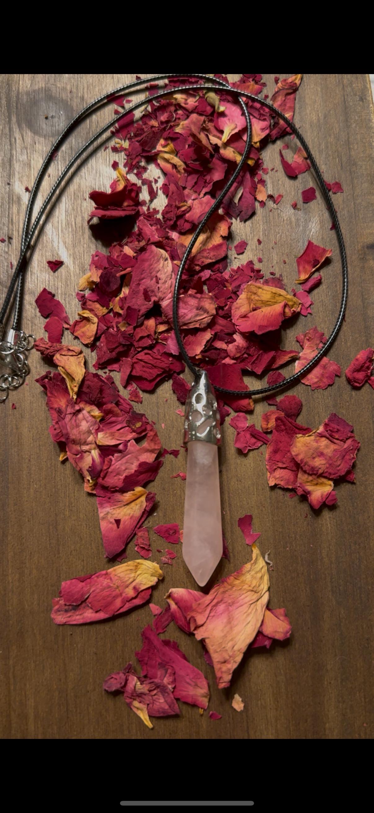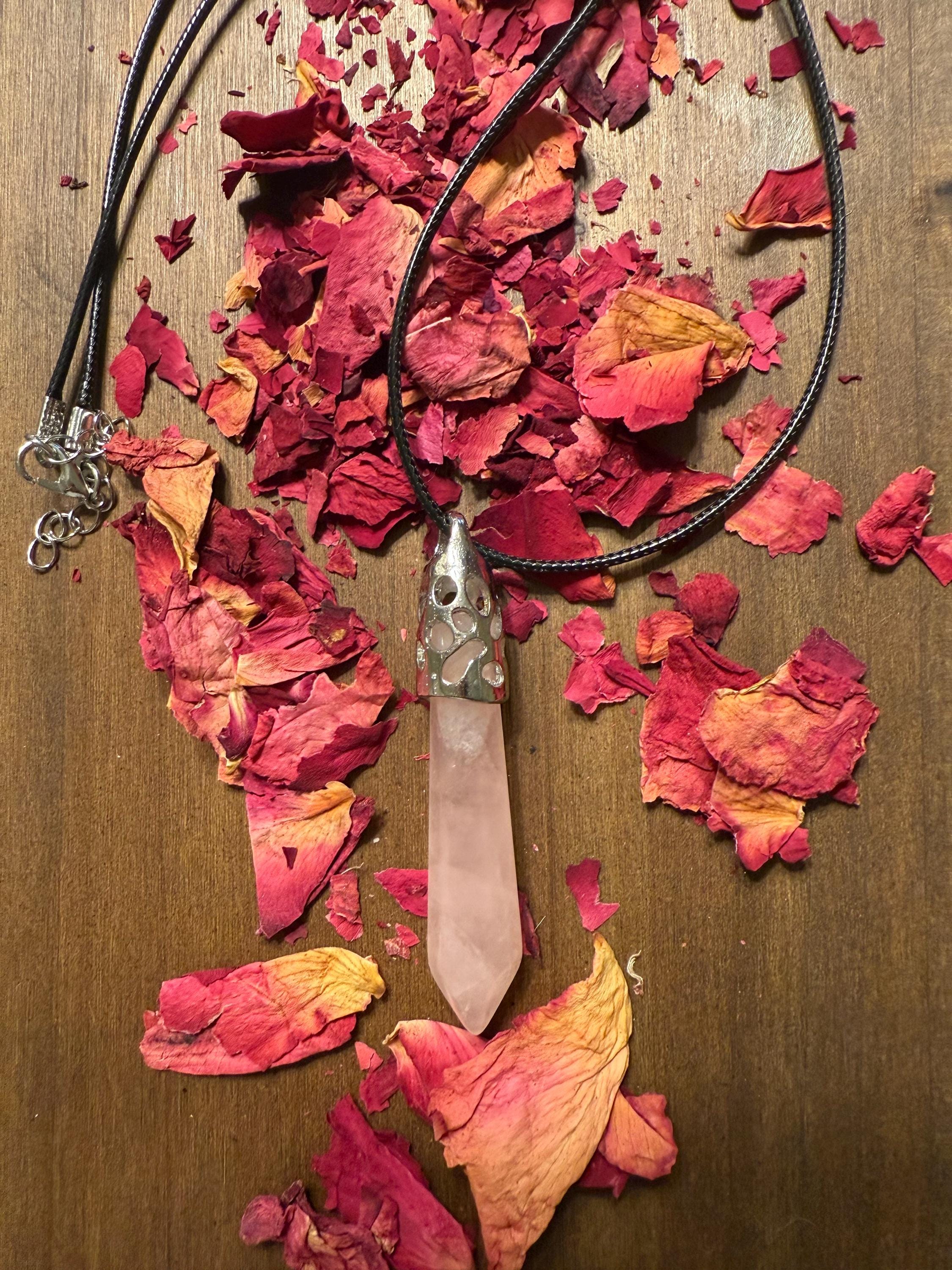 Rose Quartz Tower Pendant Necklace on Nylon Chord with silver jump cables.